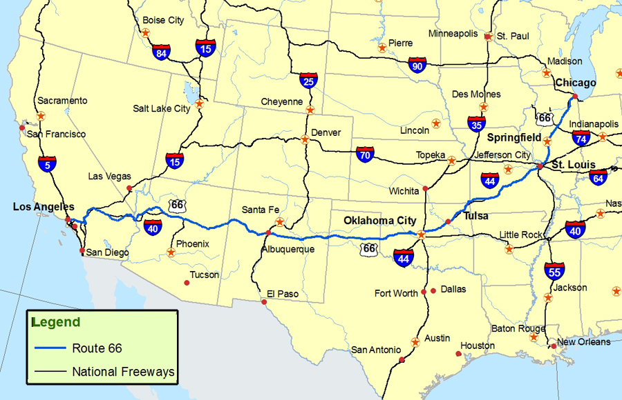 There are few highways that have the iconic, near mythic status that Route 66 holds in American culture. Route 66 stretched some 2,500 miles between Chicago, Illinois and Los Angeles, California. Route 66 became a symbol of the open road. It was America’s Pilgrims’ Road, where folks in the East or Middle-West could escape to the western reaches of the United States. In Steinbeck’s Grapes of Wrath, Route 66 offered Okies a way out of a state ravaged by the Dust Bowl and the Great Depression. Jack Kerouac mentions the iconic highway in On the Road. Large swaths of Route 66 have since been absorbed by five Interstate Highways (55, 44, 40, 15, and 10). Although Route 66 is no longer with us, its legacy still lingers in the West.