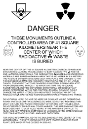 The signs posted at WIPP are supposed to last 10,000 years. Linguists designed pictograms to scare away you and me or Martians (who could visit from Roswell), to scare anyone who might dig up the radiated waste.